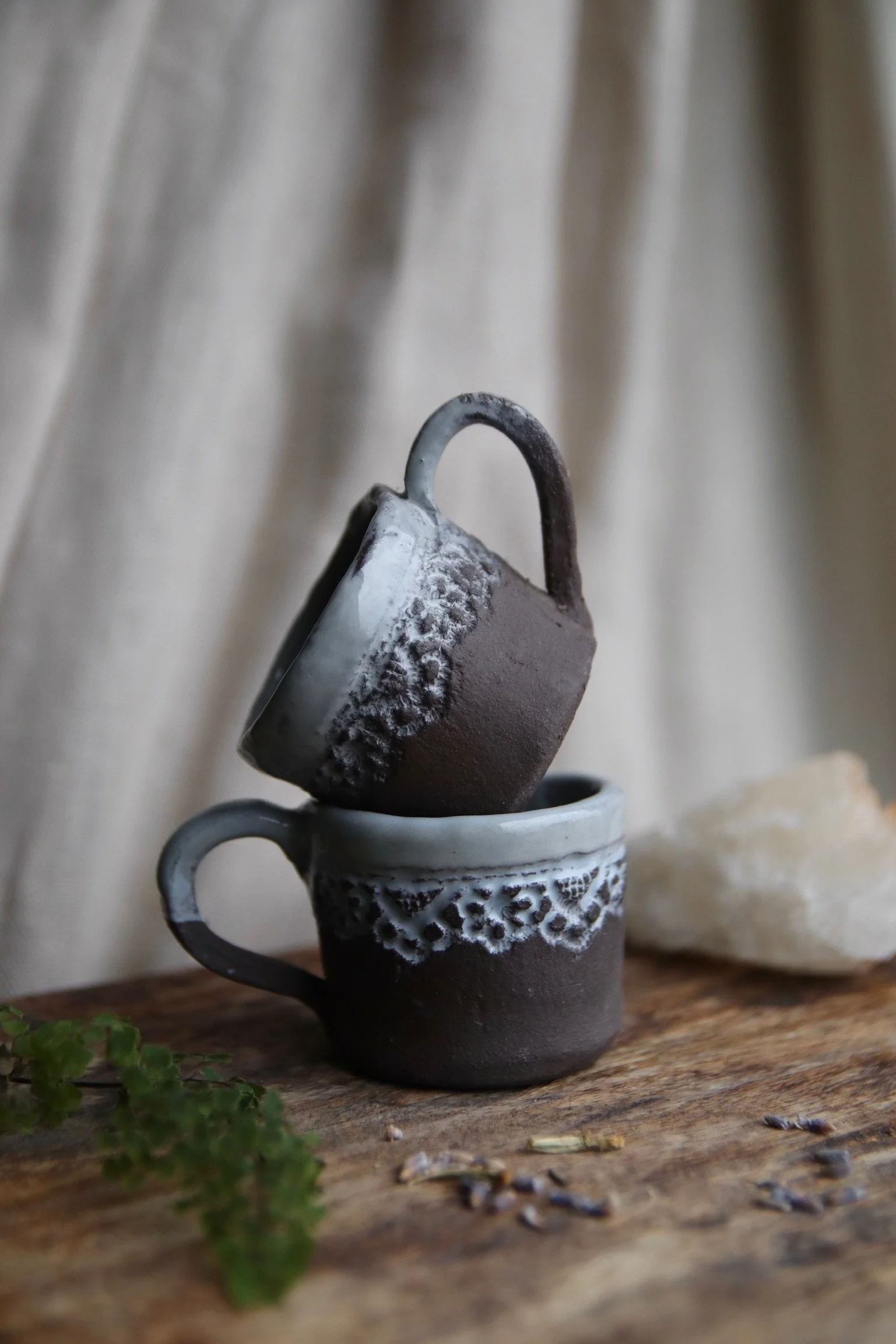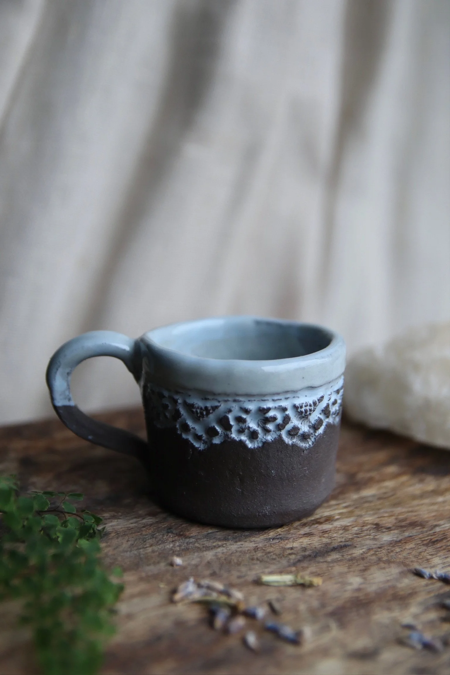 hand crafted espresso cups lovingly created out of deep brown textured clay, dipped in robin egg finish, with hand stamped Italian lace pattern.
